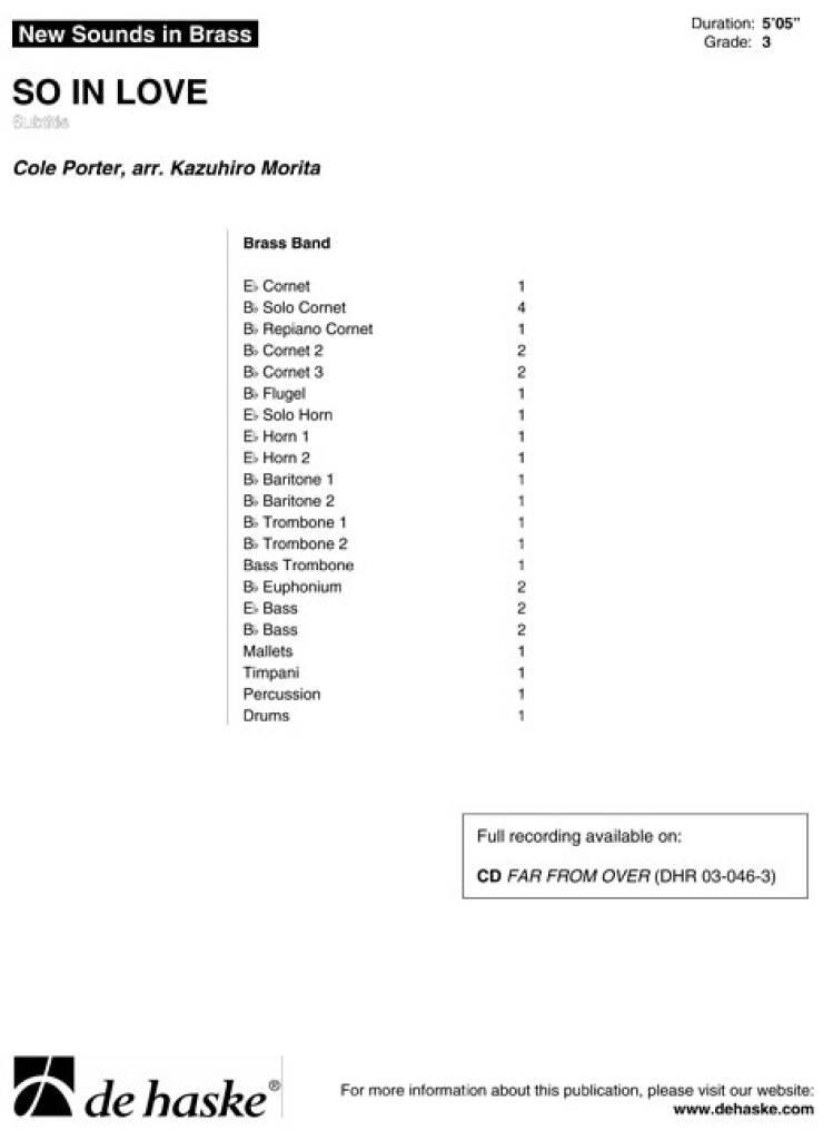 Cole Porter was one of the great masters of Broadway musicals during the thirties, forties and fifties, with So in Love, from the musical Kiss Me Kate, being one of his best loved works. It has been recorded by many artists including Bing Crosby, Lulu, Shirley Bassey and Julie Andrews, however it is the Ella Fitzgerald version that is best known. This jazzy musical classic can now be enjoyed by your brass band with this excellent new arrangement.